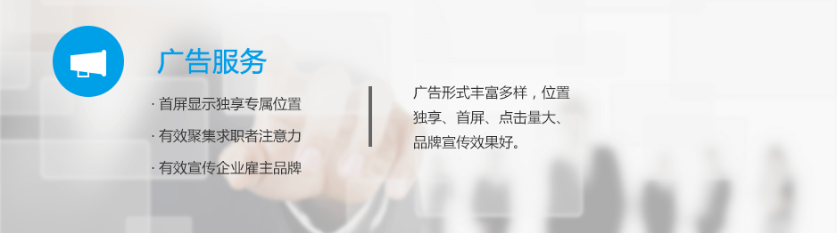 廣告服務基于龐大的網(wǎng)絡平臺,位于首屏,企業(yè)客戶可以在首頁擁有專享位置,被推薦的職位和公司始終占據(jù)求職者的第一視線,極大地聚焦求職者的注意力,從而大幅度提升招聘職位的關注度、點擊量及招聘效果。廣告有知名企業(yè)招聘、熱點招聘、品牌招聘、搜索置頂、海報等多種類型。企業(yè)客戶可根據(jù)招聘需求選擇合適的廣告類型,完成招聘需求。